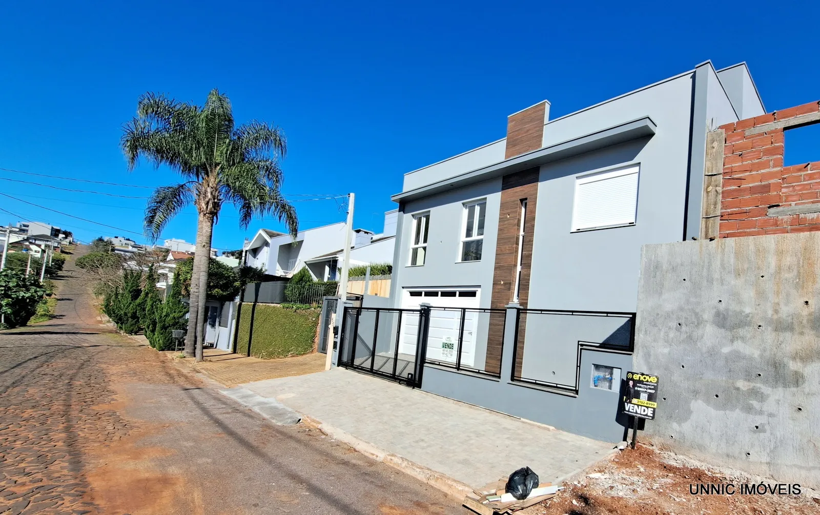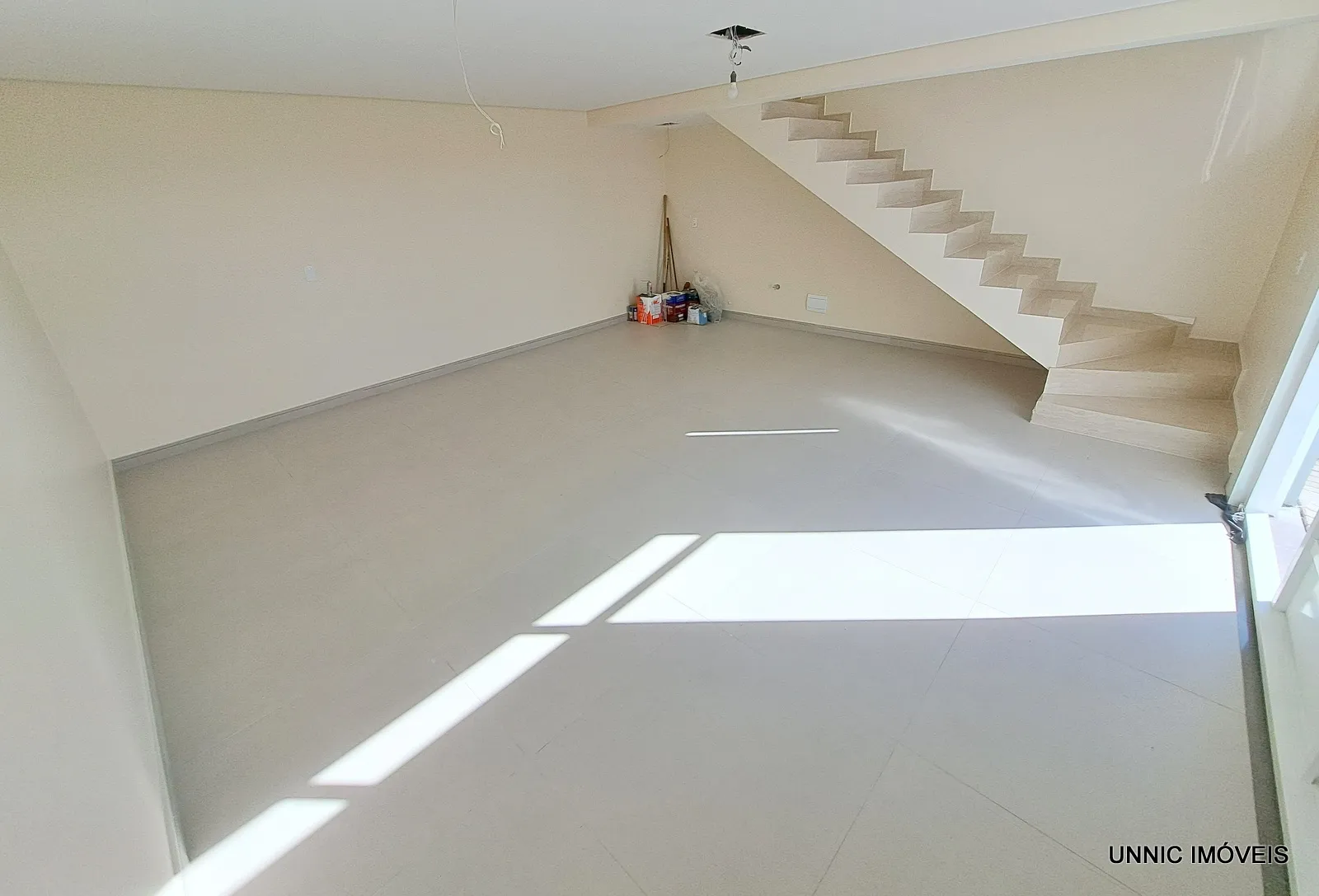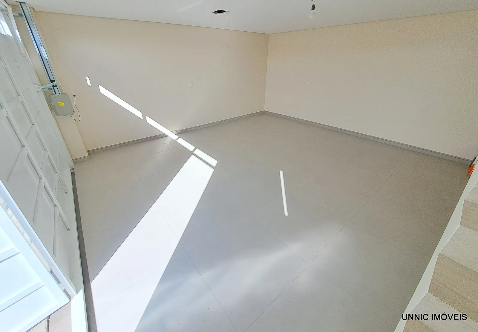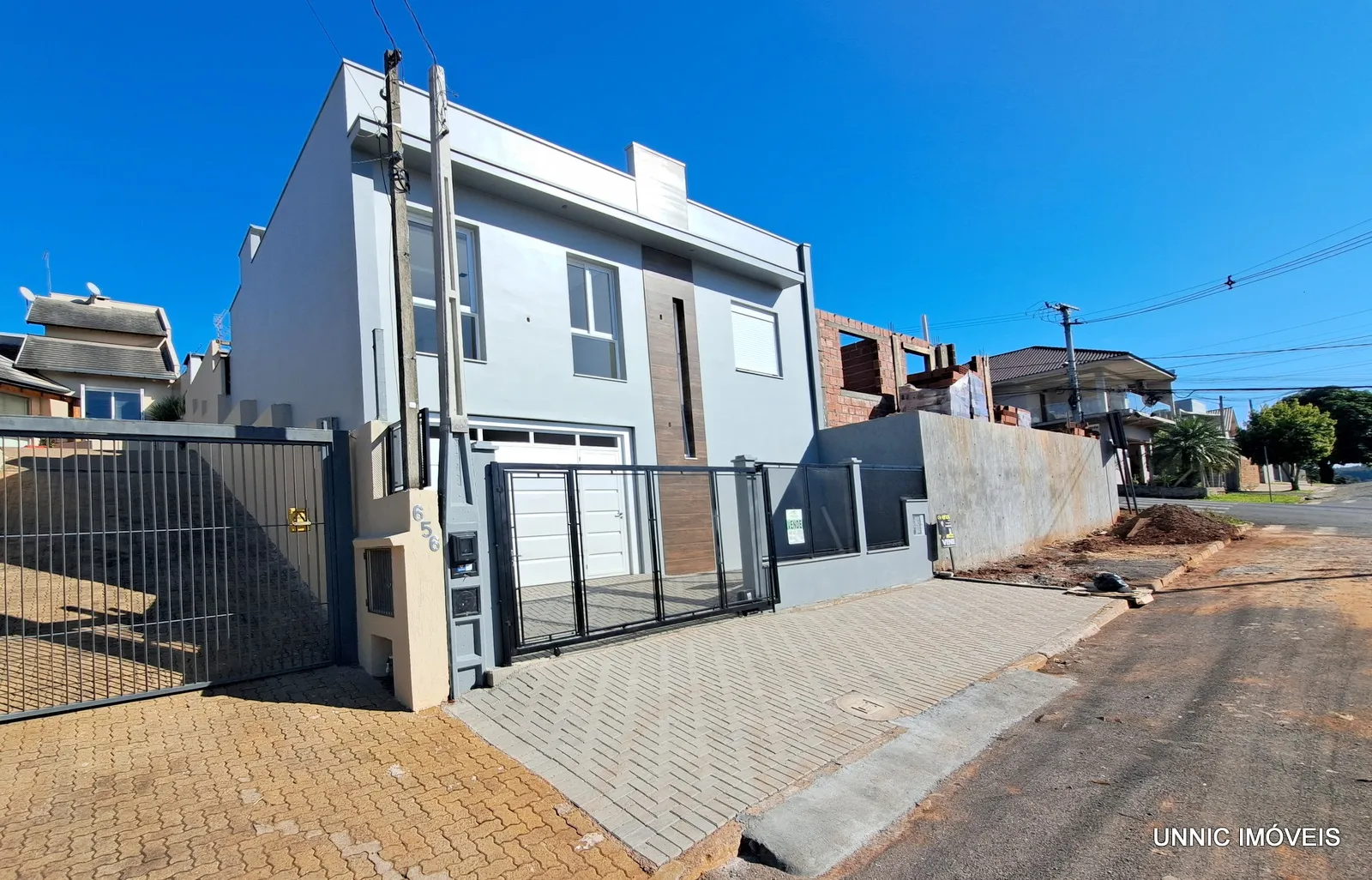 Sobrado novo com 137,11m² privativos, 3 dormitórios sendo 1 suíte, banheiro social, sala de estar e jantar integrado com cozinha, churrasqueira, lavanderia, garagem para 2 carros lado a lado, portão eletrônico, calçada. Terreno todo murado e gradeado na frente.
