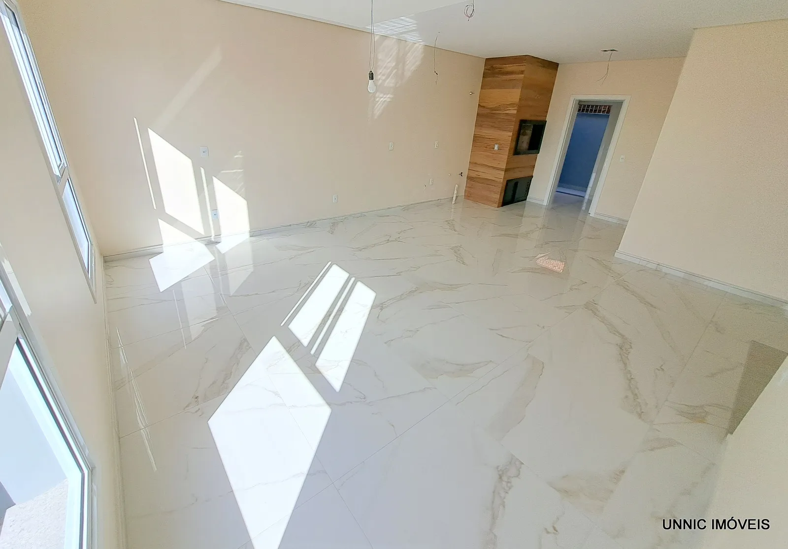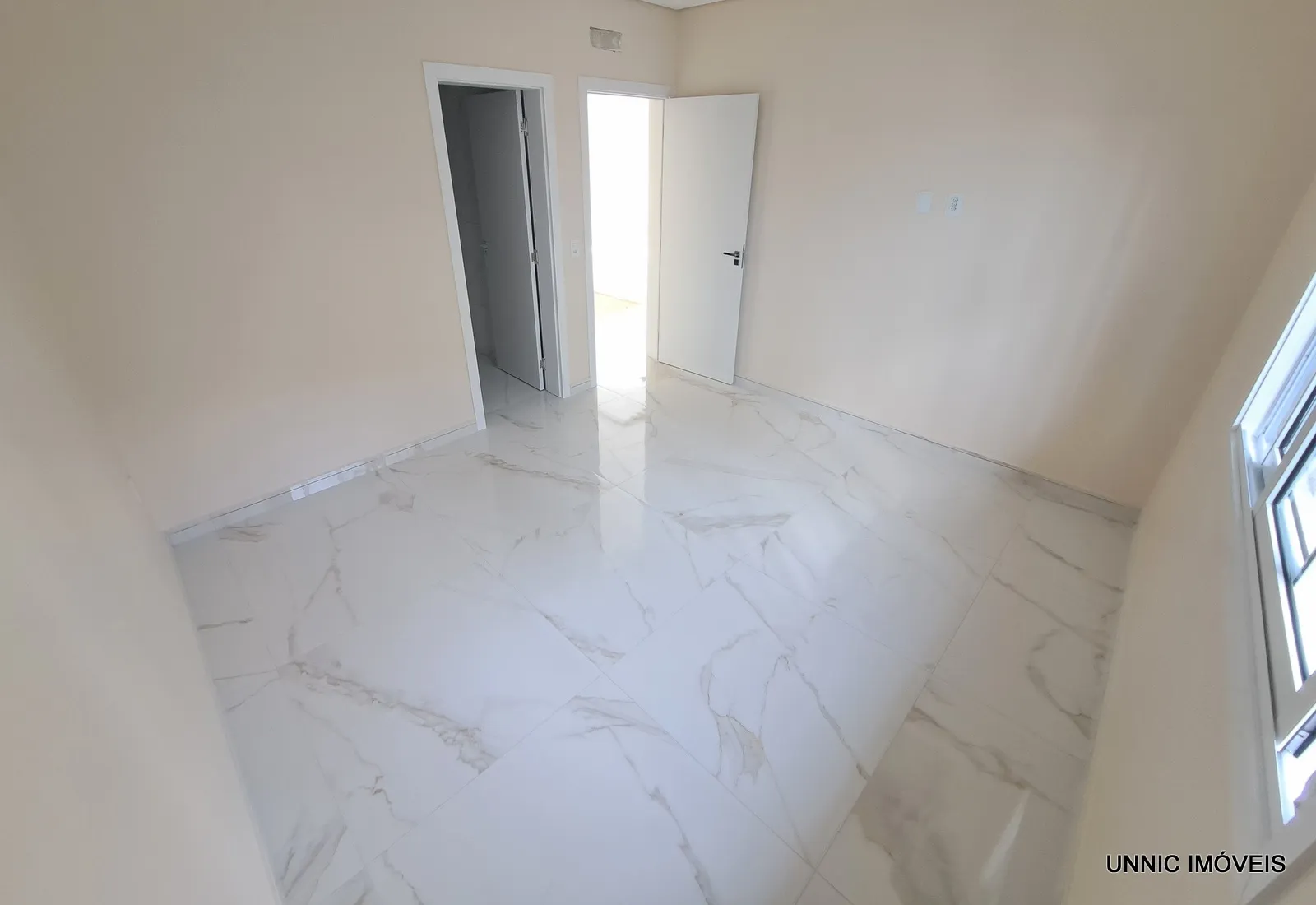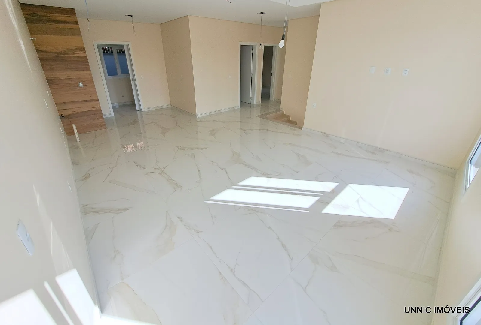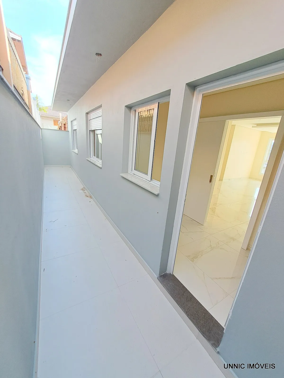 Sobrado novo com 137,11m² privativos, 3 dormitórios sendo 1 suíte, banheiro social, sala de estar e jantar integrado com cozinha, churrasqueira, lavanderia, garagem para 2 carros lado a lado, portão eletrônico, calçada. Terreno todo murado e gradeado na frente.