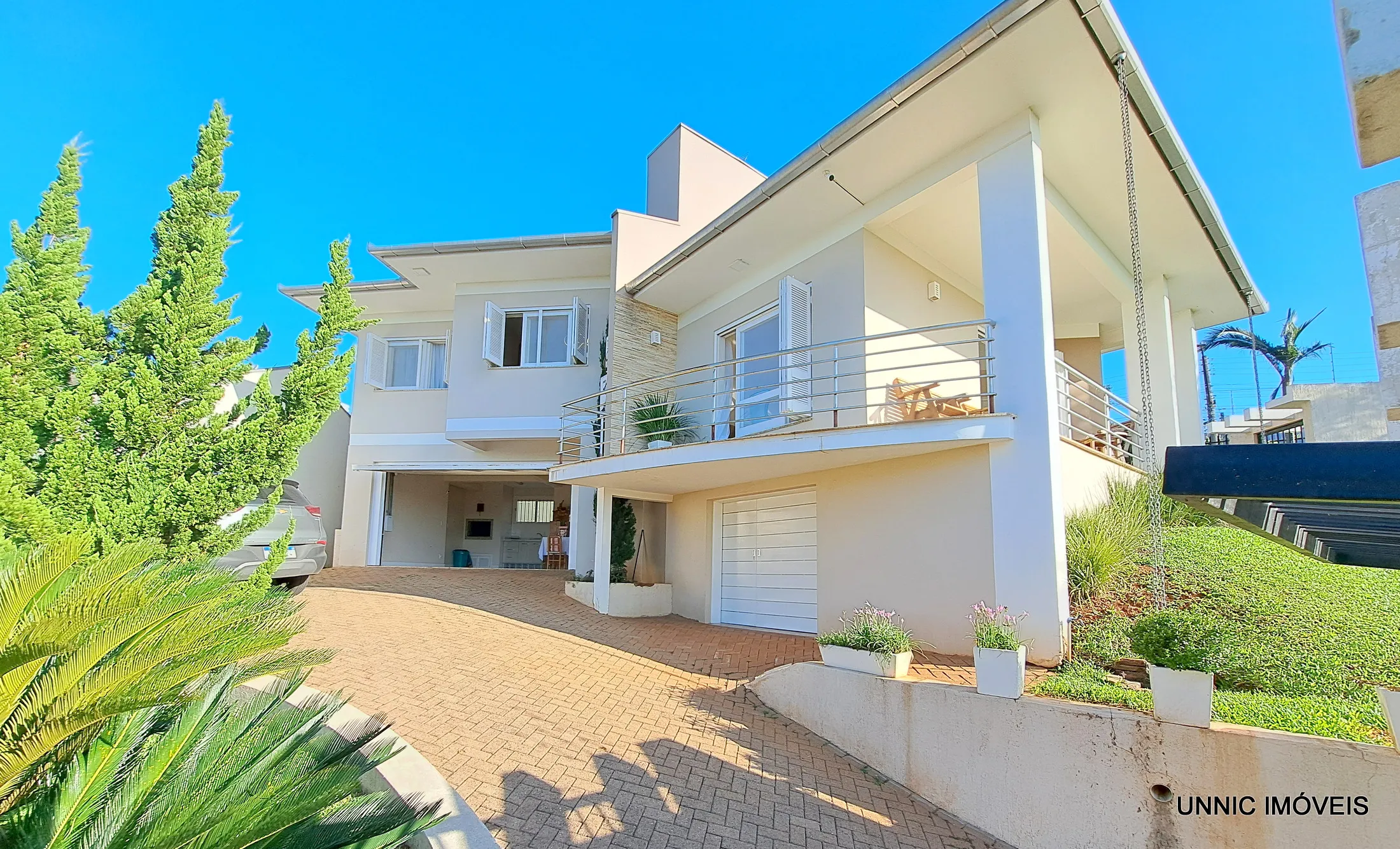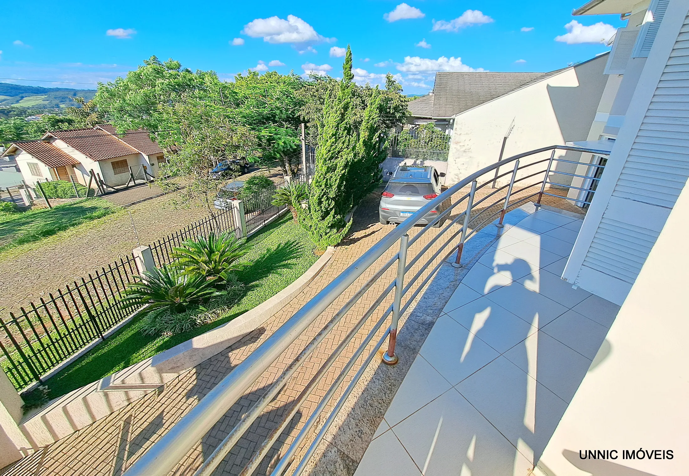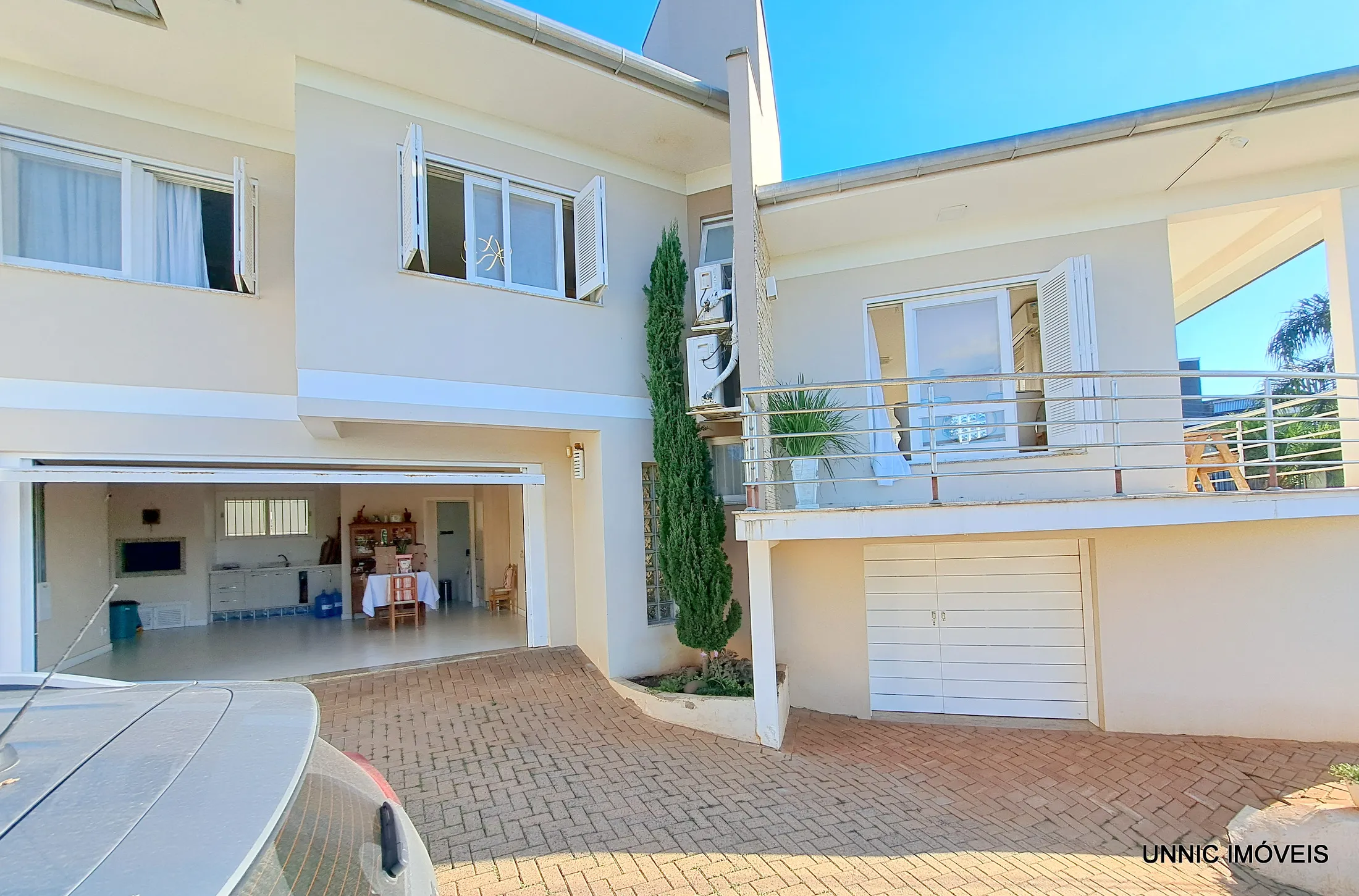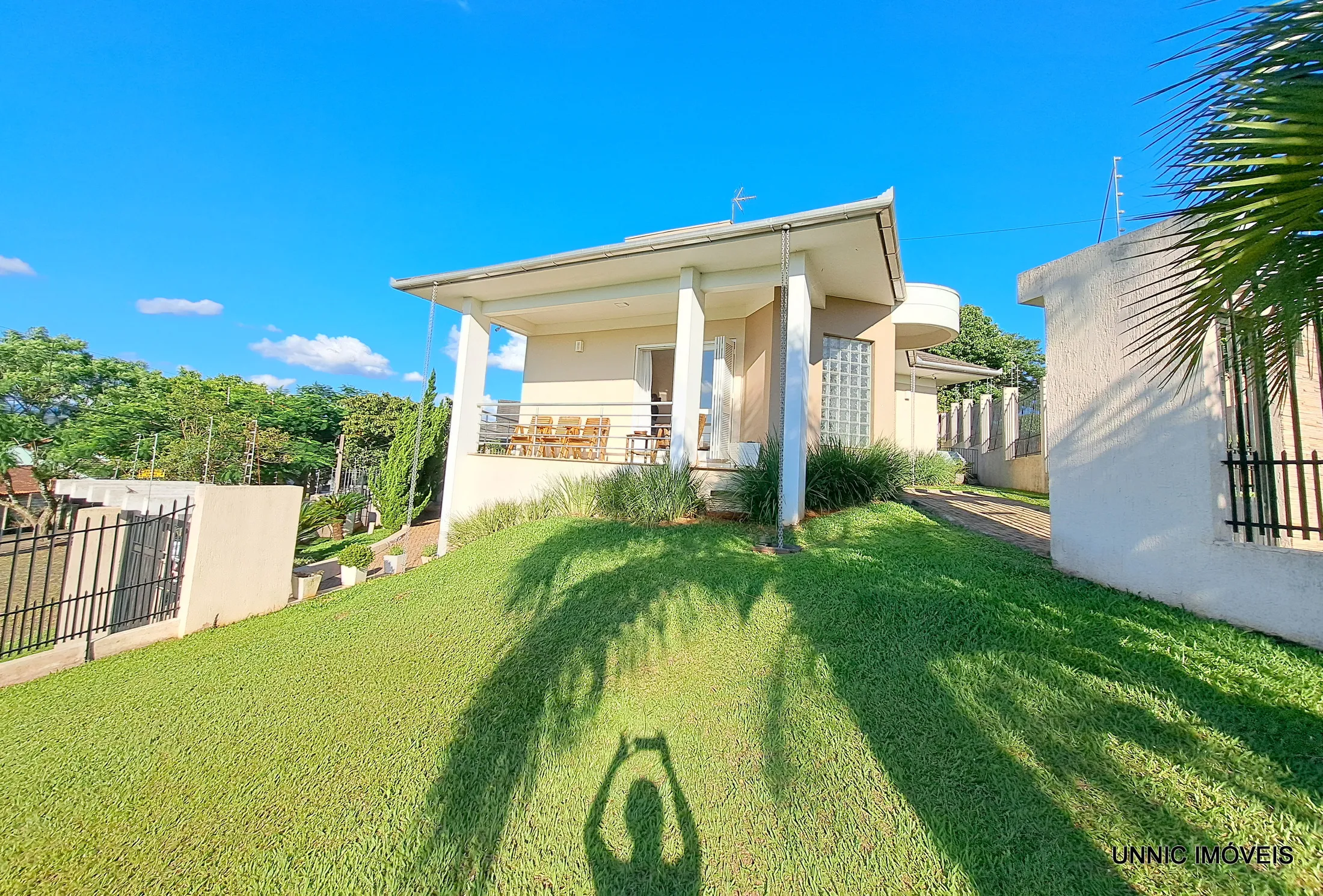 Sobrado de alvenaria com 196,67m², 3 dormitórios sendo 1 suíte, sala de estar e jantar, cozinha, sacada aberta, 2 banheiros, lavanderia, garagem ampla para 2 acrros lado a lado com churrasqueira e pia, água quente, alarme, cerca elétrica, porão/despensa. Terreno de esquina medindo 560m², todo murado, gradeado com 2 portões eletrônicos, calçada, jardim, gramado amplo.